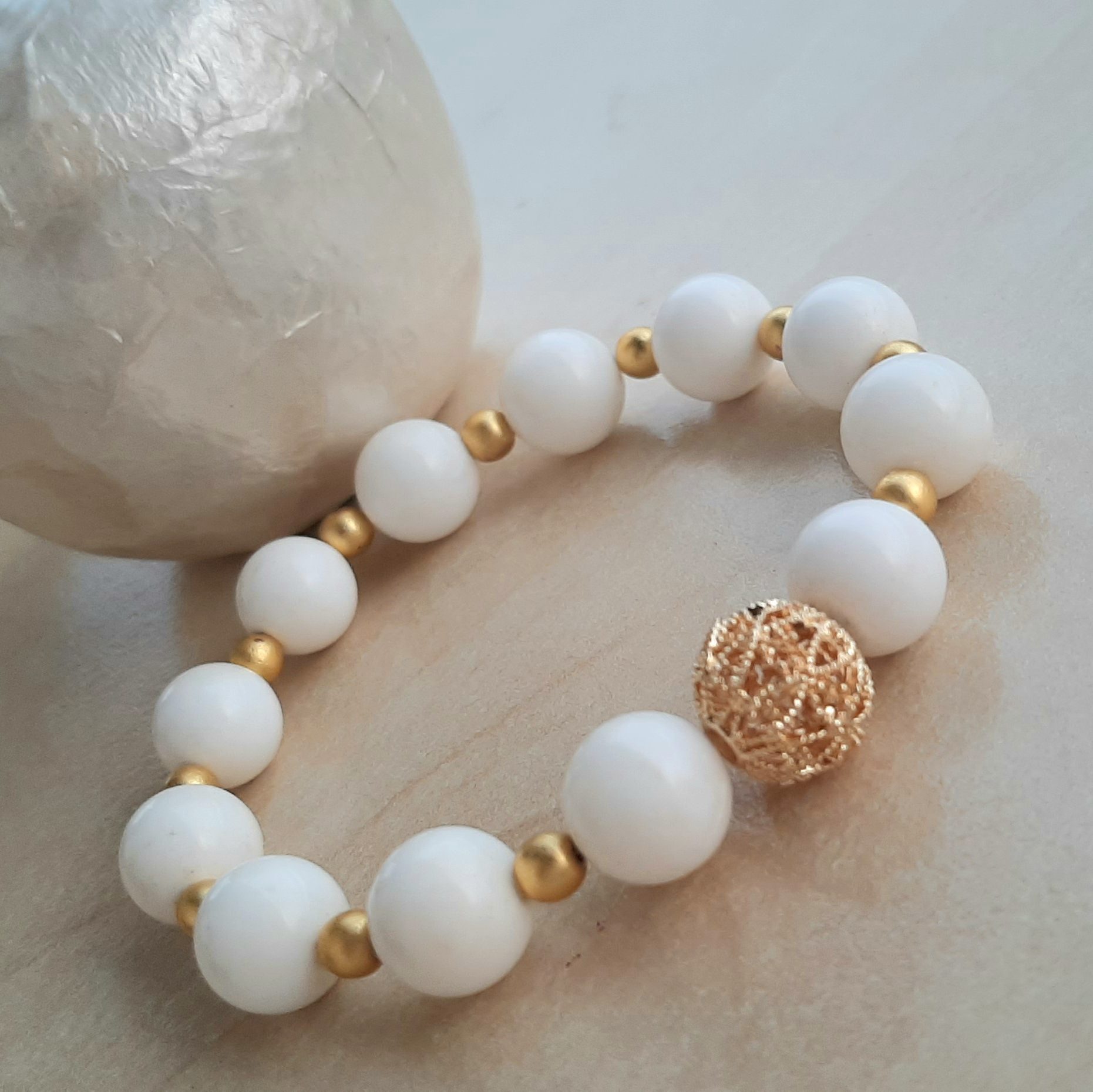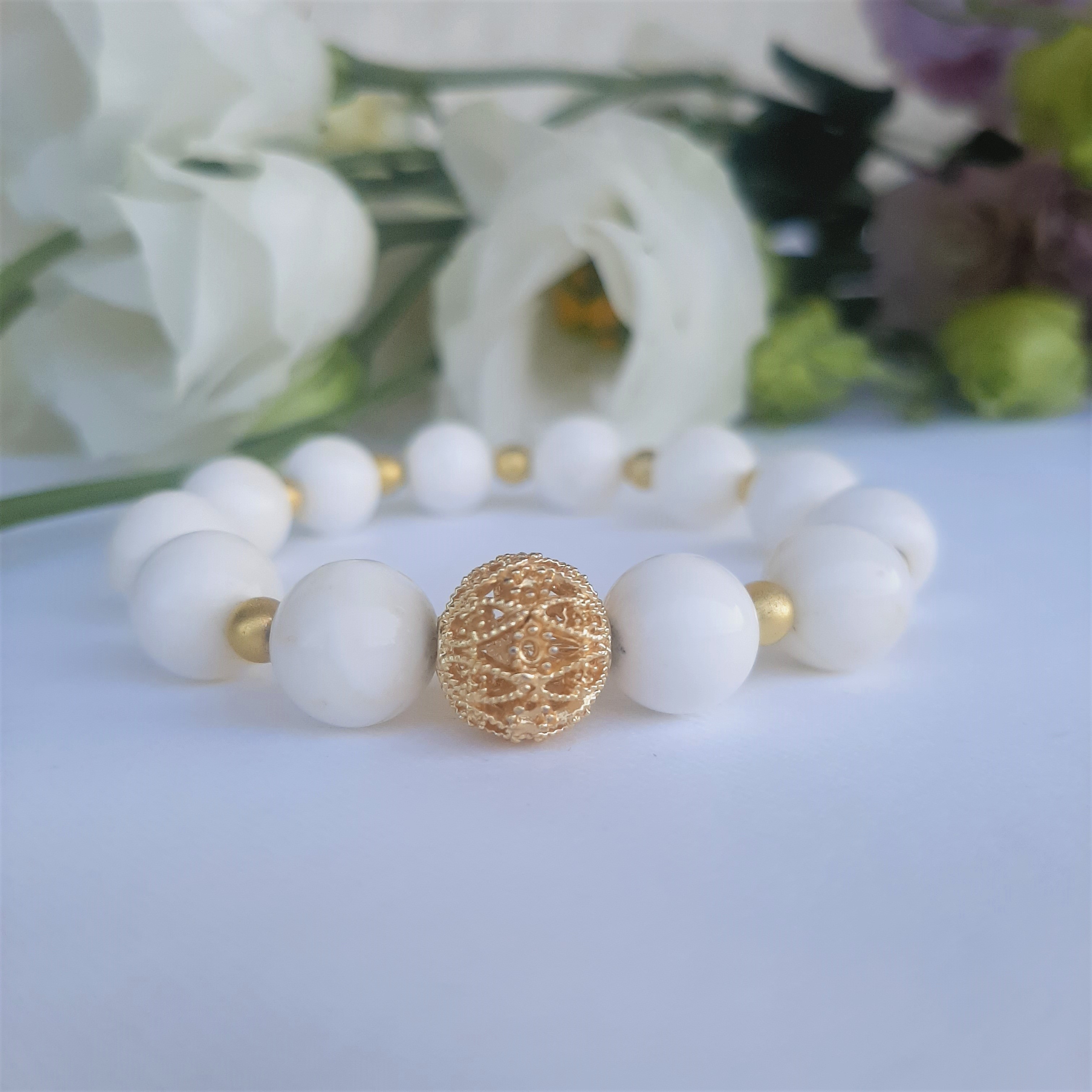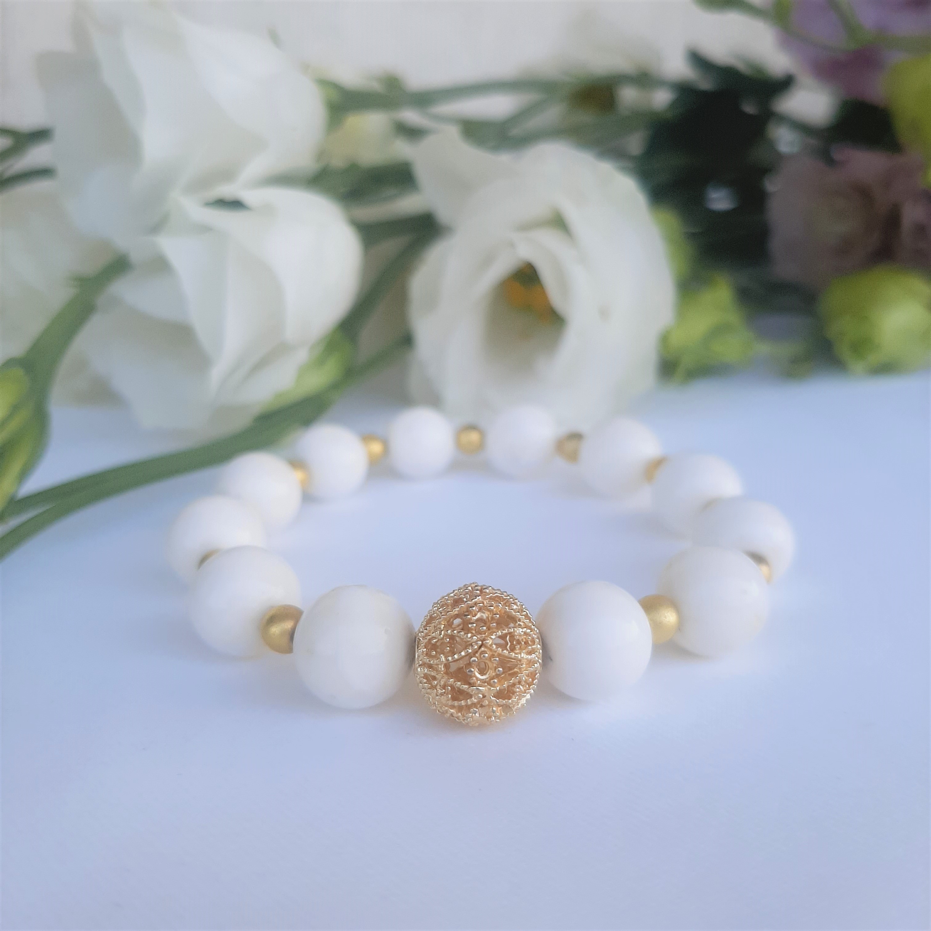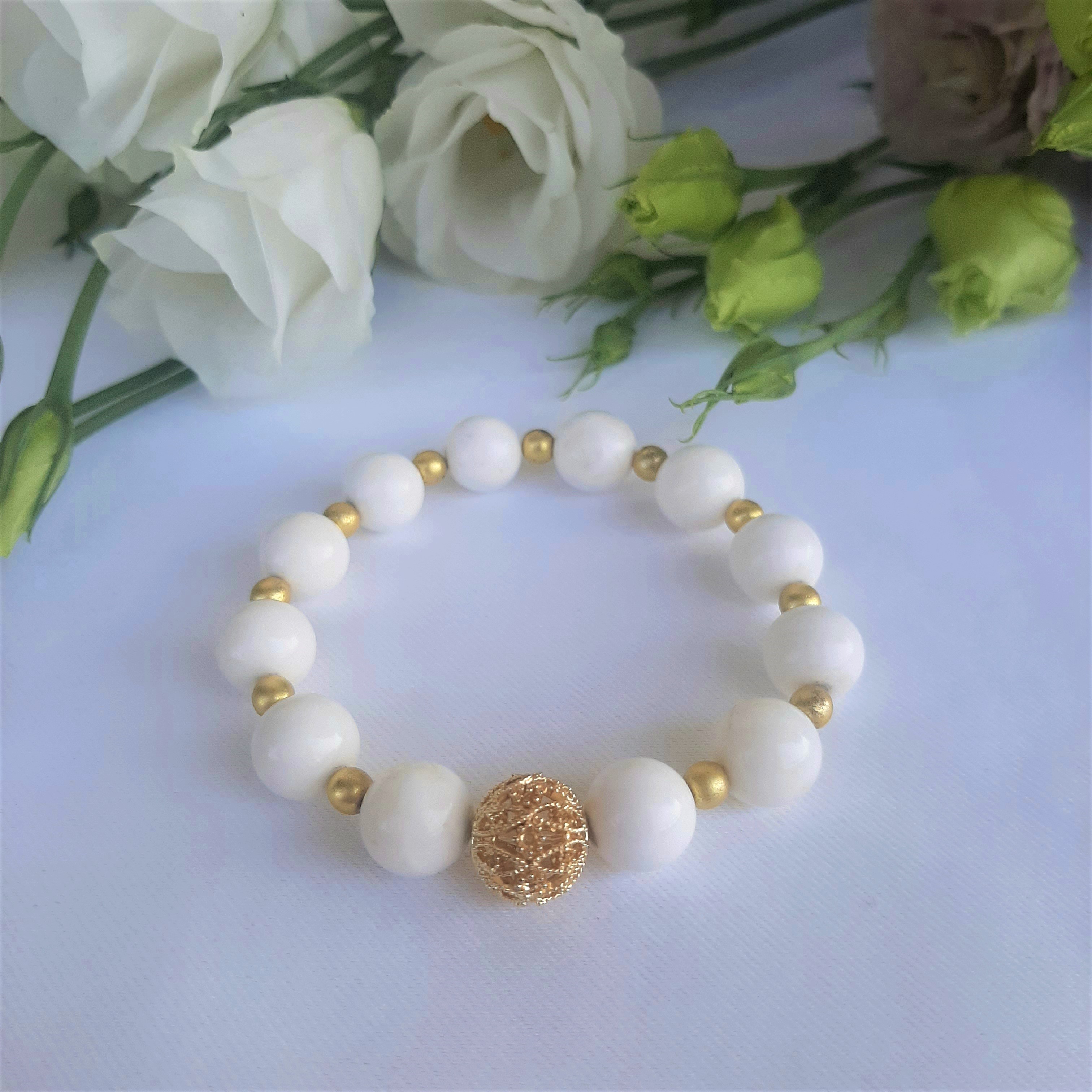 Bratara alba creatie pietre naturale, face parte din colectia „summer vibe”si este accesoriul perfect ce vine in completarea outfit-lui tau.