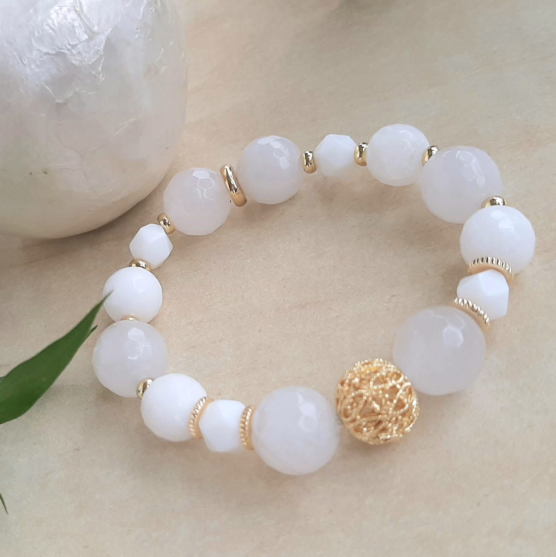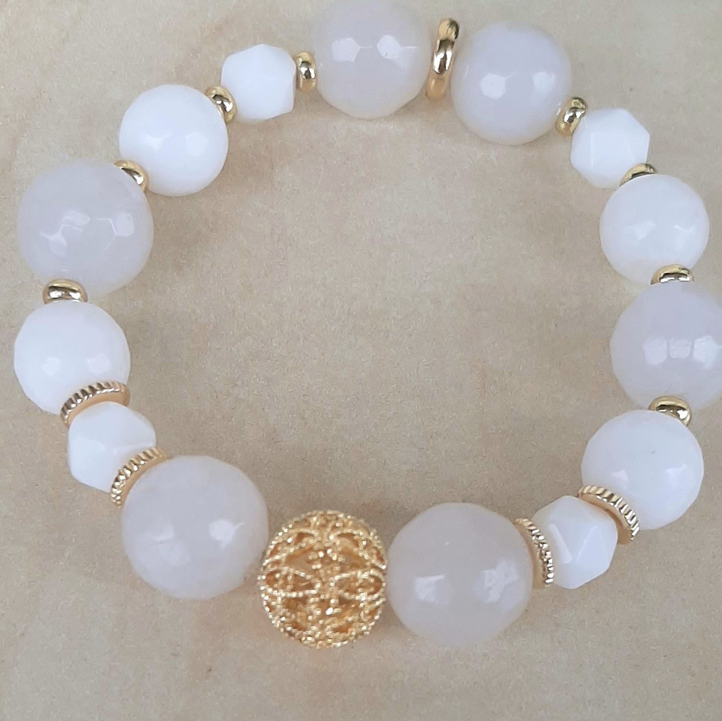 Bratara alba, realizata din pietre semipretioase naturale cu accesorii placate cu aur de 14k,de buna calitate.