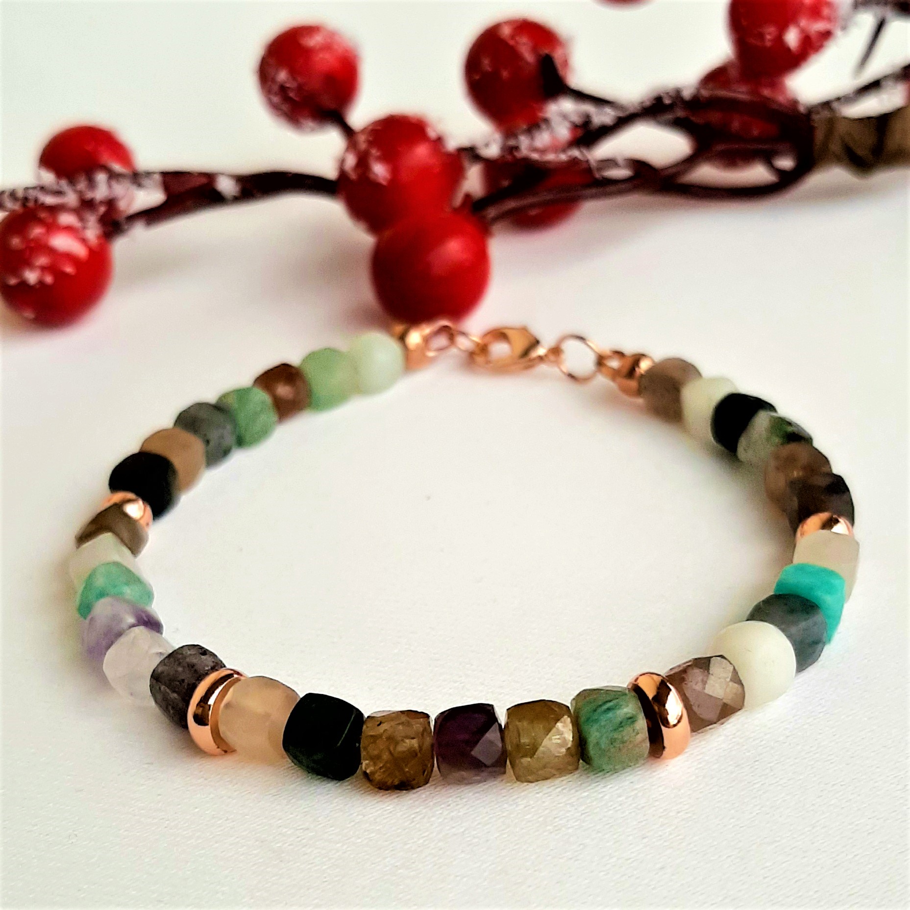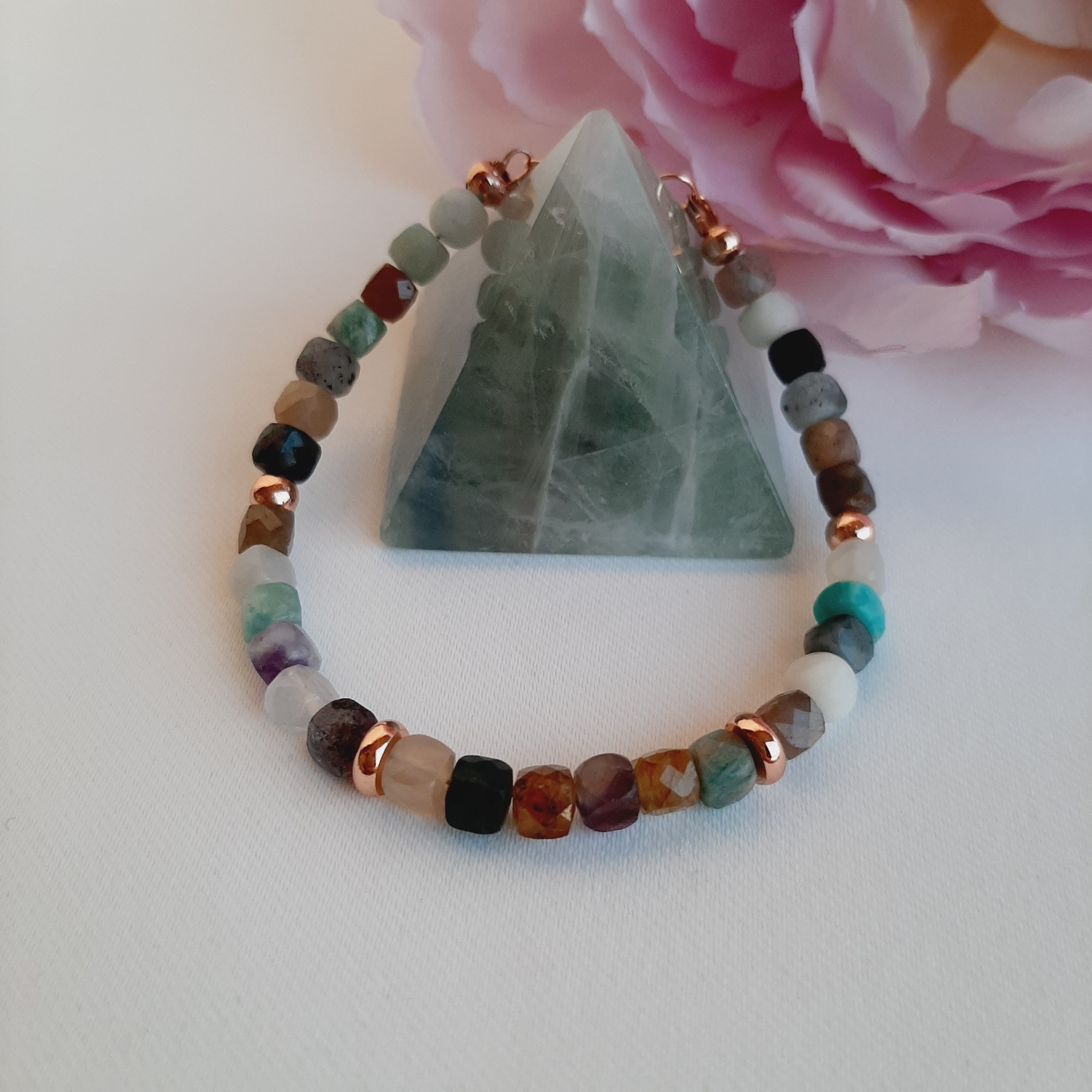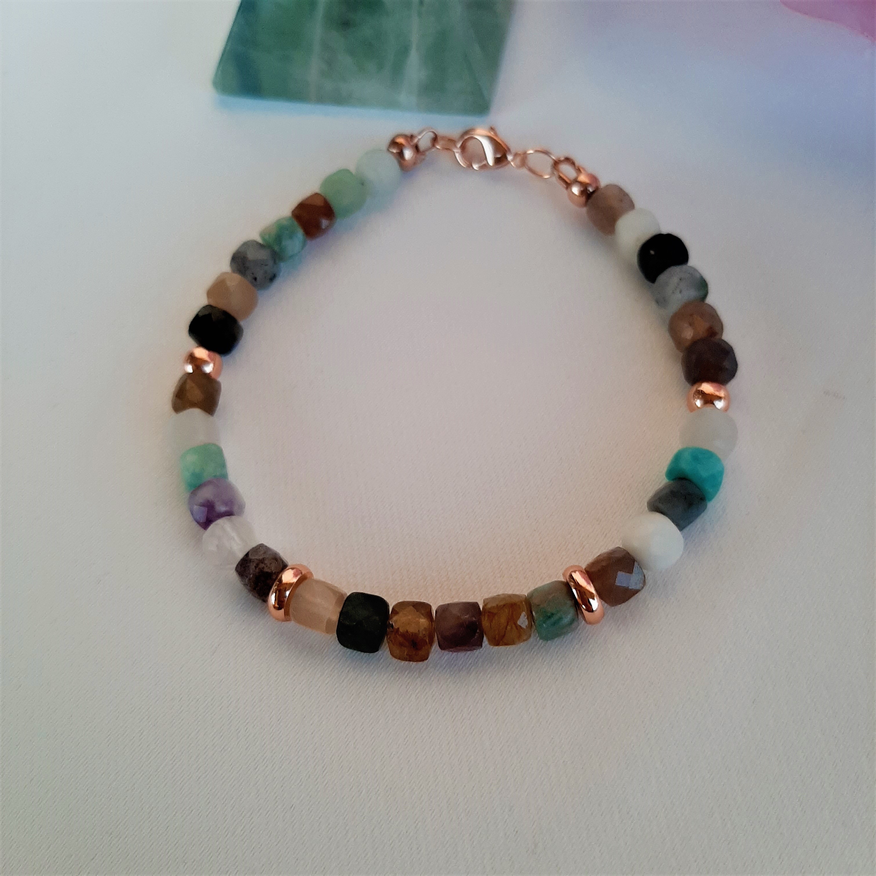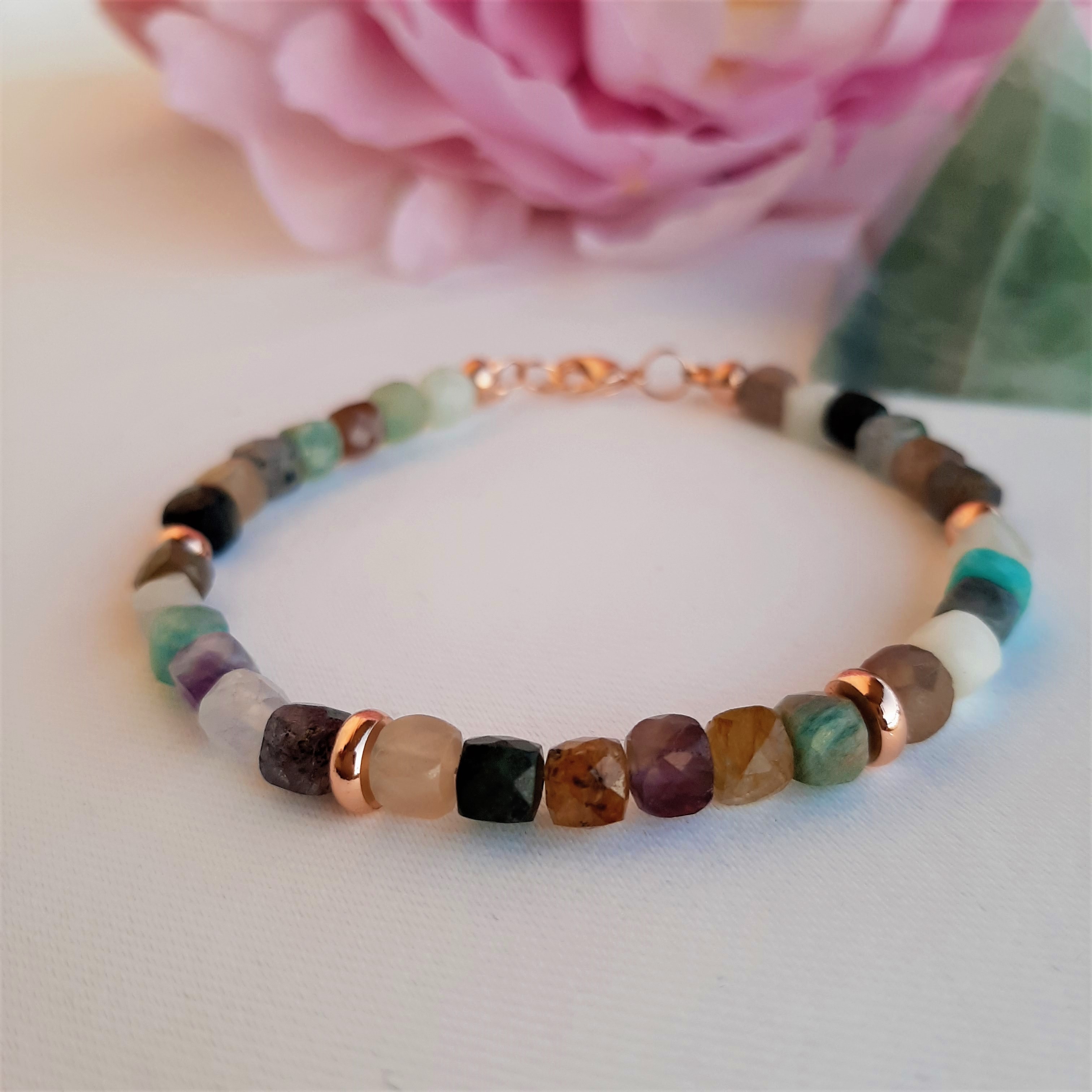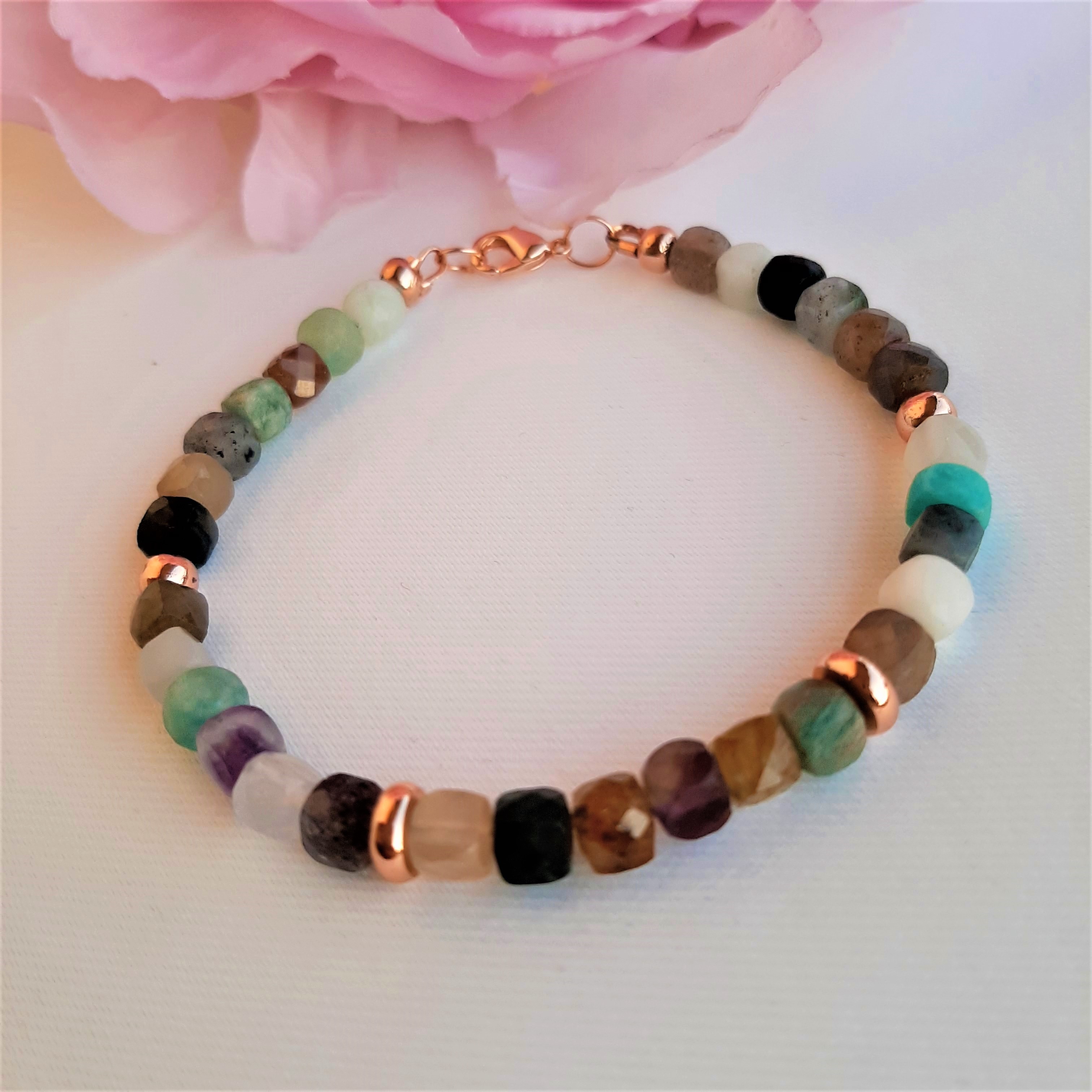 Bratara mix din pietre semipretioase este accesorizata cu spacere de calitate, rodiate roze cuprat, si inchizatoare lobster rodiata.